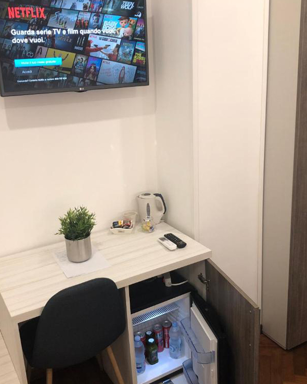 Questa camera climatizzata presenta arredi moderni, un letto matrimoniale, TV satellitare, minibar e bagno privato completo di asciugacapelli e set di cortesia.